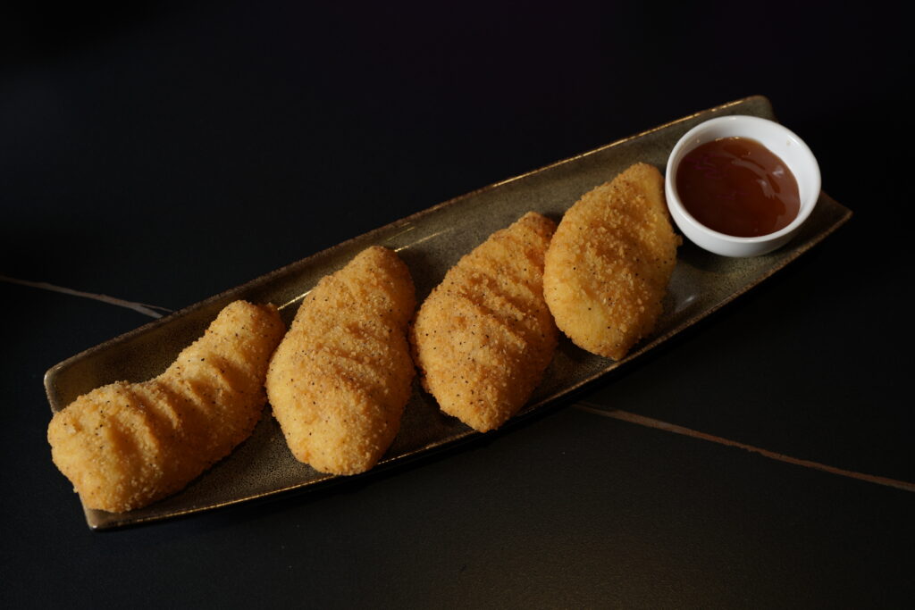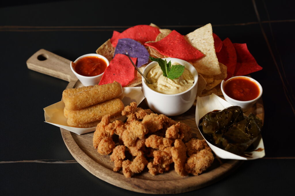 Hummus, dolma, cheesesticks and popcorn chicken with nachos